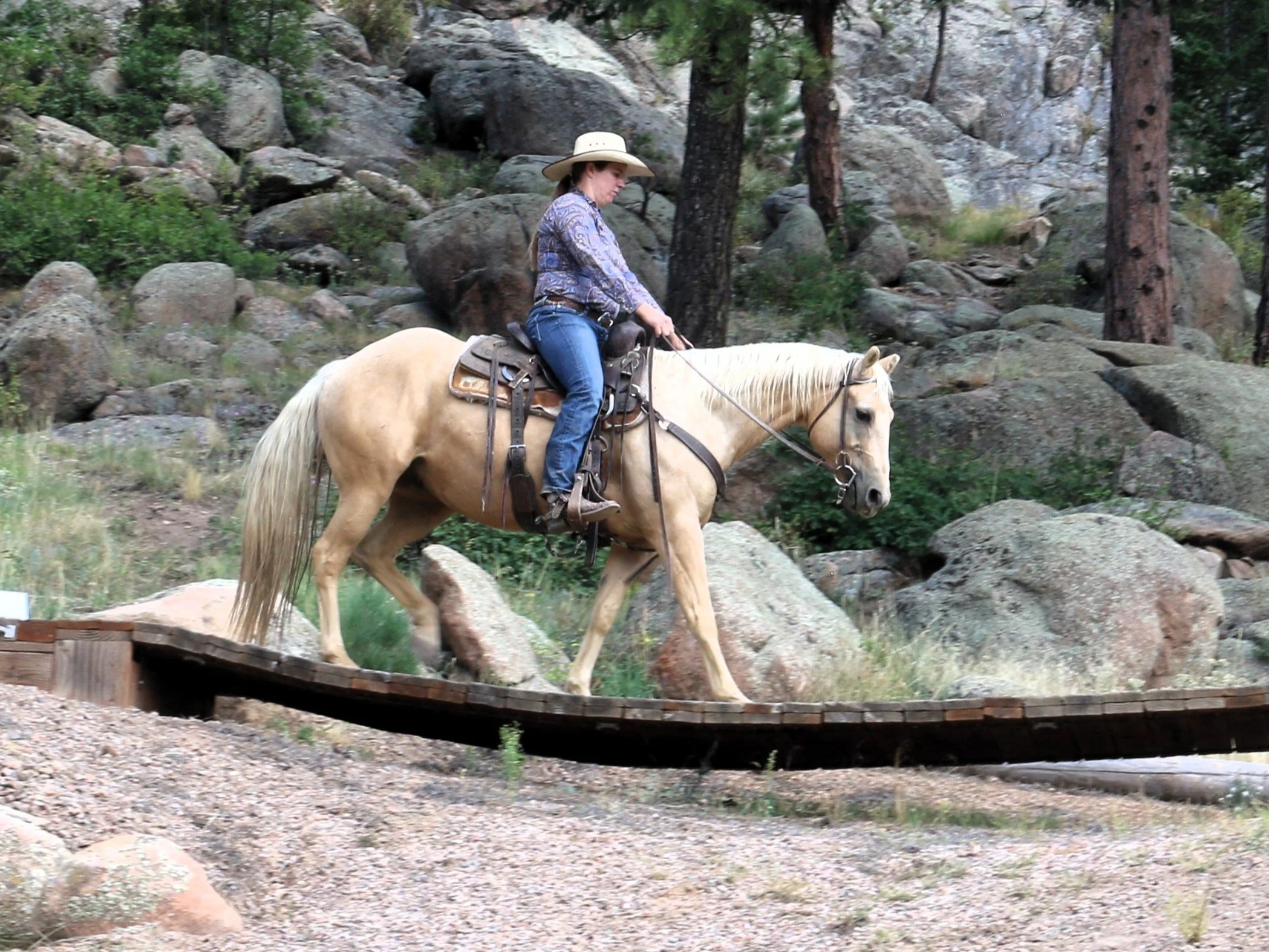 Quill is an AQHA palomino gelding with a long resume. He has competed in the Horseman’s Challenge at the National Western Stock Show as well as local gymkhanas, carried the mail on the historical Pony Express trail, shown off in a parade, ridden to the local brewery, and packed an entire bull elk 8 miles out of the Flat Tops Mountains by himself. He was ridden by confident, advanced kids in summer camps. He has tackled many obstacles, including suspension bridges, rolling bridges, ponds deep enough to swim in, the Texas two step, a teeter totter, curtains, soccer balls, and tunnels. He has carried an umbrella, flags, and kids double and bareback. He celebrated the 4th of July with sparklers and saluted his heritage on Halloween by dressing up as a “quarter” horse. He enjoys moving cows and will lay his ears back if they don’t move quickly enough. He has ridden out alone and in groups. He is the same horse whether riding in good weather or driving wind. He is like riding a mountain goat over rocky terrain. His reaction when riding up on a rattlesnake was to stop and wait for his rider’s next cue. He has been hauled long distances. His trot is smooth enough that Carly rode him comfortably while pregnant. Everyone comments that his frost-bitten ears are “So Cute!” With Smart Little Lena, Shining Spark, and Dash for Cash all on his papers, he has the foundation to go whichever direction you want him to!